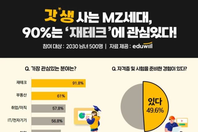 에듀윌 “MZ 세대, 가장 관심있는 분야는 재테크와 부동산” 2030의 절반은 성인이 되어서도 꾸준히 공부를 하고 있었으며 가장 관심있는 분야는 "재테크" 등 경제 관련 분야인 것으로 나타났다. 종합교육기업 에듀윌이 이같은 내용이 담긴 설문조사 결과를 발표했다. 이번 조사는 성인 남녀 500명을 대상으로 진행됐 2023.04.08