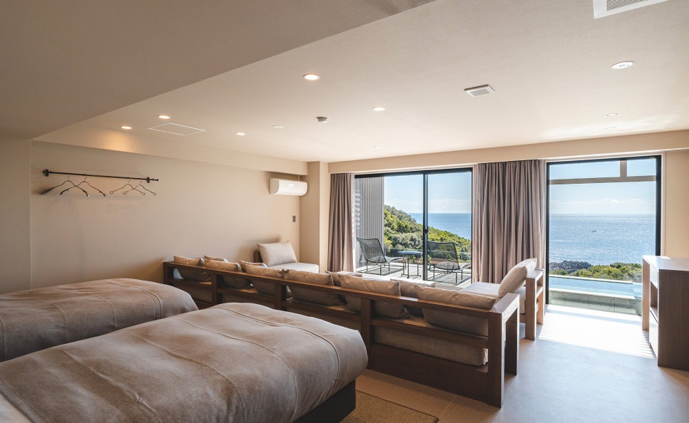 로비에 들어서면 탁 트인 수평선이 가장 먼저 눈에 들어온다. 바다와 하늘이 맞닿은 풍경이 시원하게 펼쳐지고, 밤이 되면 별빛 아래에서 온천을 즐길 수 있어 여행의 무드를 한층 더한다. 객실은 디럭스, 슈페리어, 스위트로 나뉘며, 웨스턴 스타일과 재패니즈 스타일을 모두 갖췄다. 일부 객실에는 노천탕이 있어 태평양 절경을 프라이빗하게 감상하며 온천욕을 즐길 수 있다.