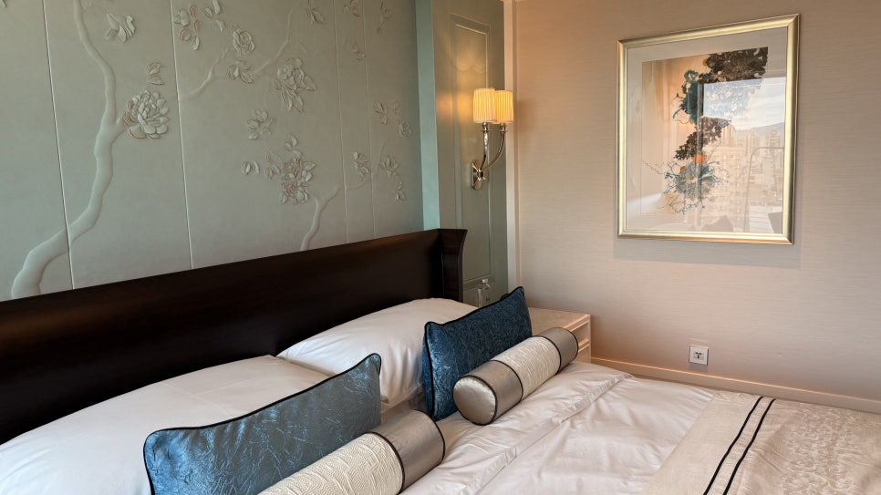 침대는 킹사이즈로, 침구는 이탈리아산 480수 면으로 제작되어 몸을 감싸는 듯한 포근함을 제공합니다. 여러 가지 베개 옵션도 준비돼 있어 개인 취향에 맞춰 교체할 수 있는 것도 고급 호텔에서만 누릴 수 있는 세심함이죠.