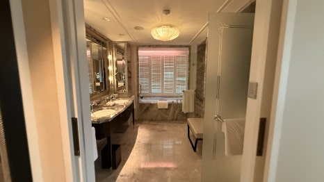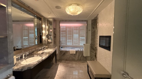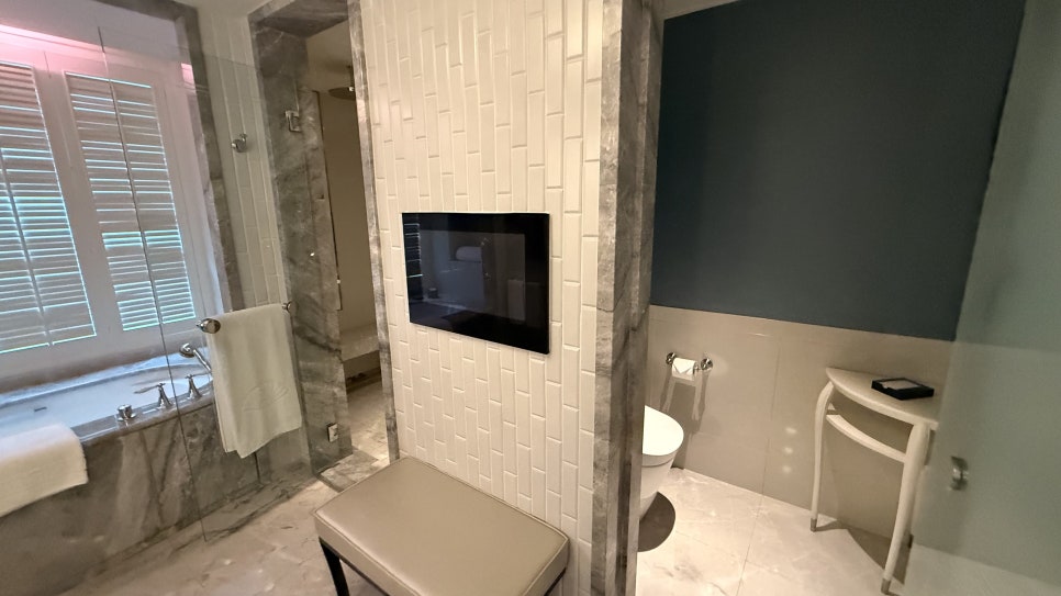 대리석 욕실은 욕조와 샤워부스가 완전히 분리되어 있고, 더블 세면대, 프리미엄 어메니티(디퓨저, 바디워시, 샴푸 포함)까지 완비되어 있습니다. 특히, 욕조에 몸을 담그고 창밖 도시 야경을 감상하는 순간은 이 호텔의 하이라이트 중 하나입니다.