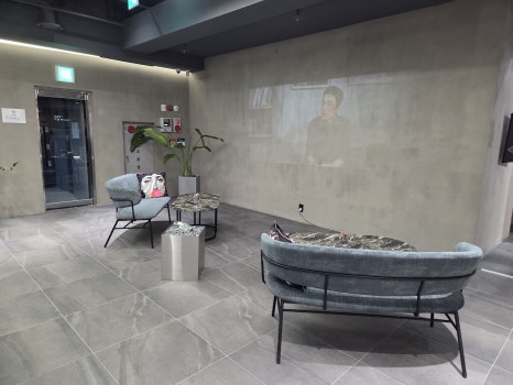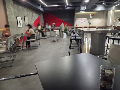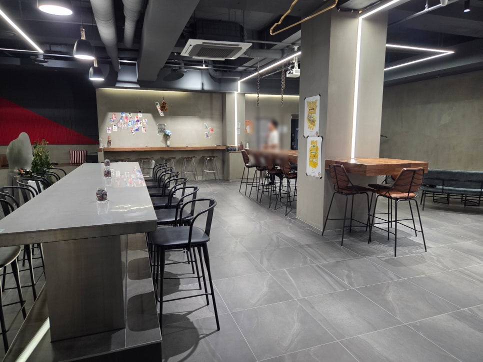 이것보세요오오오오.. 벽면에 스크린 부착해서 쏘아서 나오는 영화 혹은 드라마 장면들.. 너무 느낌좋고요… 콘크리트벽도 왠지 힙한 느낌. 그리고 테이블간 간격도 있어서 편안하게 앉을 수 있고.
