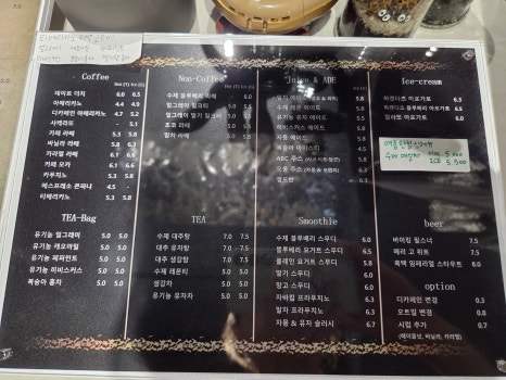 *논커피: 수제블루베리스무디, 블루베리요거트, 플레인요거트, 자바침프라푸치노, 말차프라푸치노,딸기스무디,망고스무디, 수제블루베리아이스크림, 에스프레소아포가토, 데이르드립아포가토, 젤라또아포가토, 블루베리라떼, 초코라떼, 말차라떼, 유기농케모마일티, 유기농얼그레이티, 유기농히비스커스티, 유기농유자티,수제레몬티,수제대추탕,대추유자탕,수제자몽주스,수제레몬에이드,유기농유자에이드