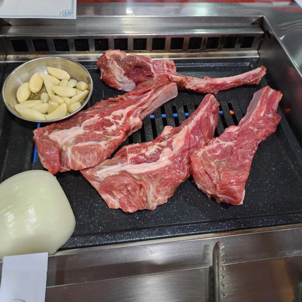 삼각갈비(200g) 28,000원, 수육(200g) 28,000원, 전골 1인 15,000원