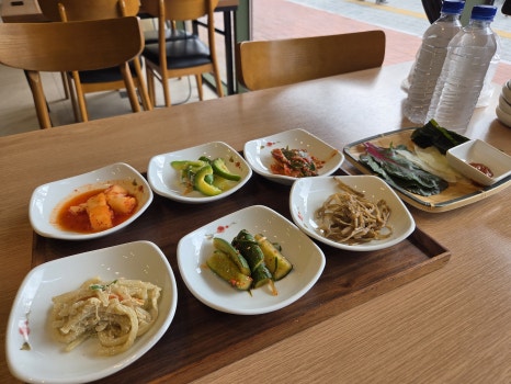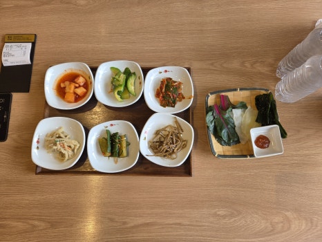 반찬 무엇…?? 이렇게나 많다고? 총 7가지 반찬이 나왔다. 내가 간 날 나온 반찬구성은, 「들깨무나물무침, 파김치, 깍두기, 오이무침, 연근조림, 애호박나물, 쌈」