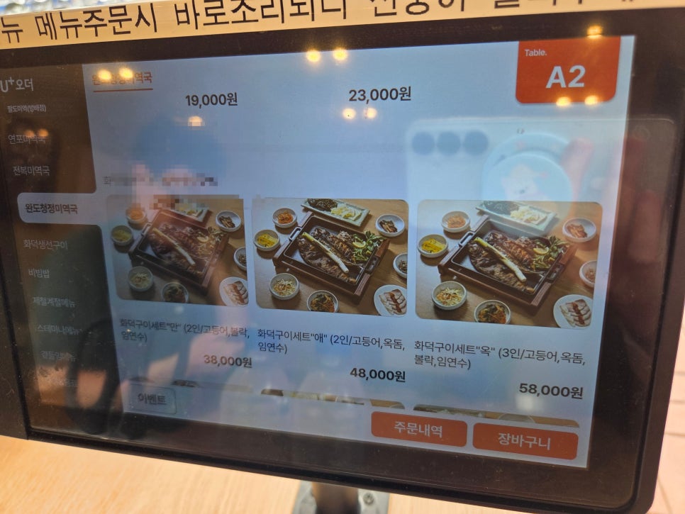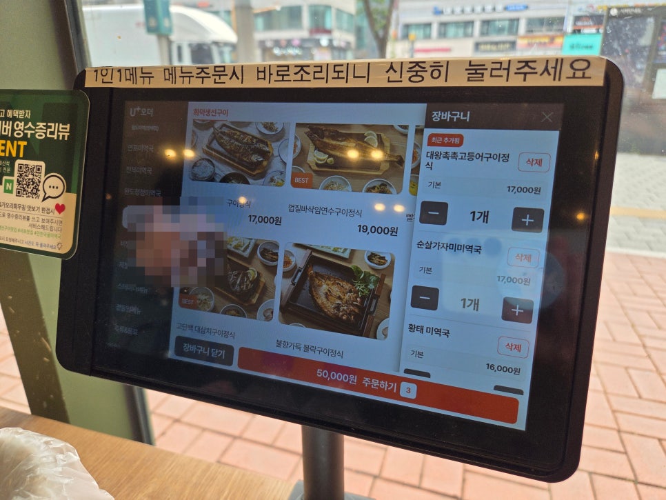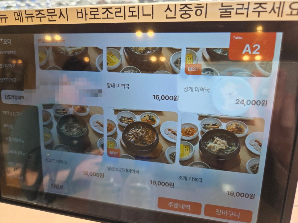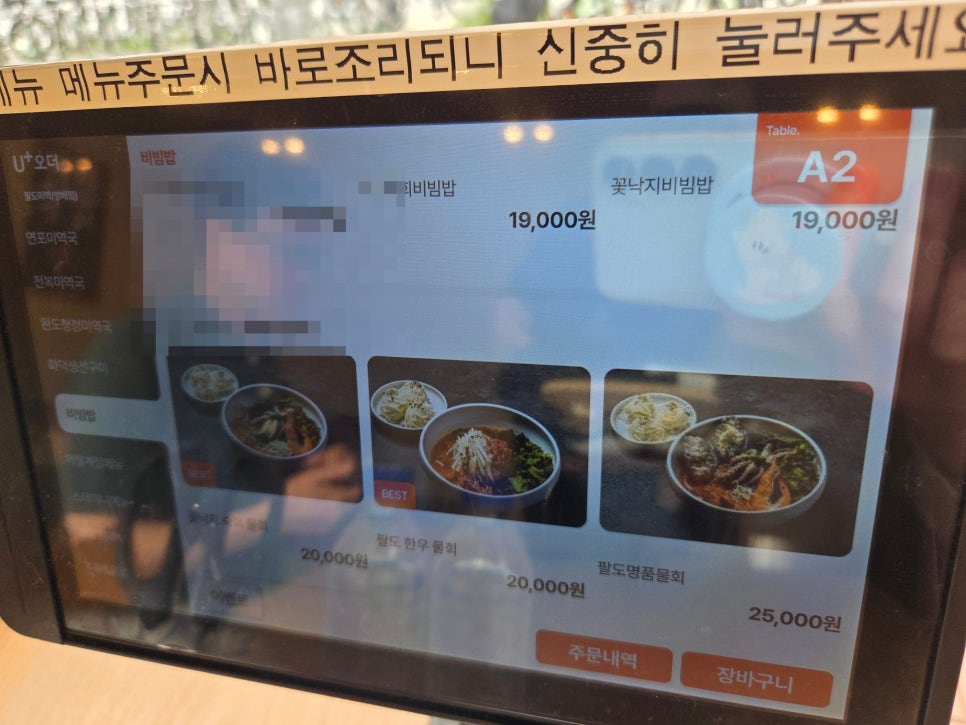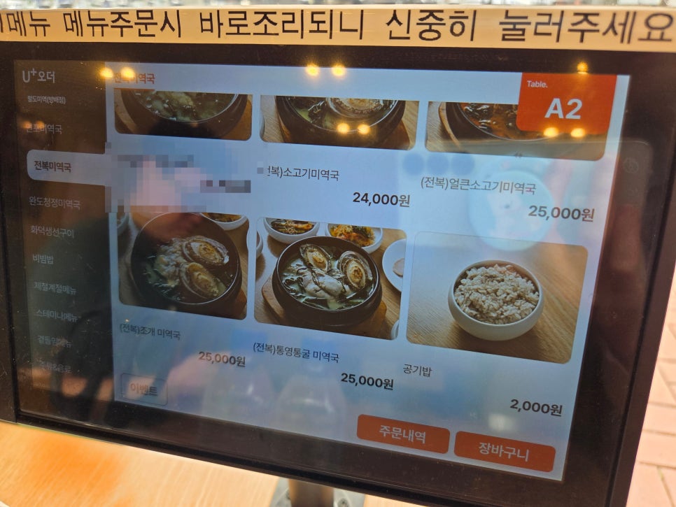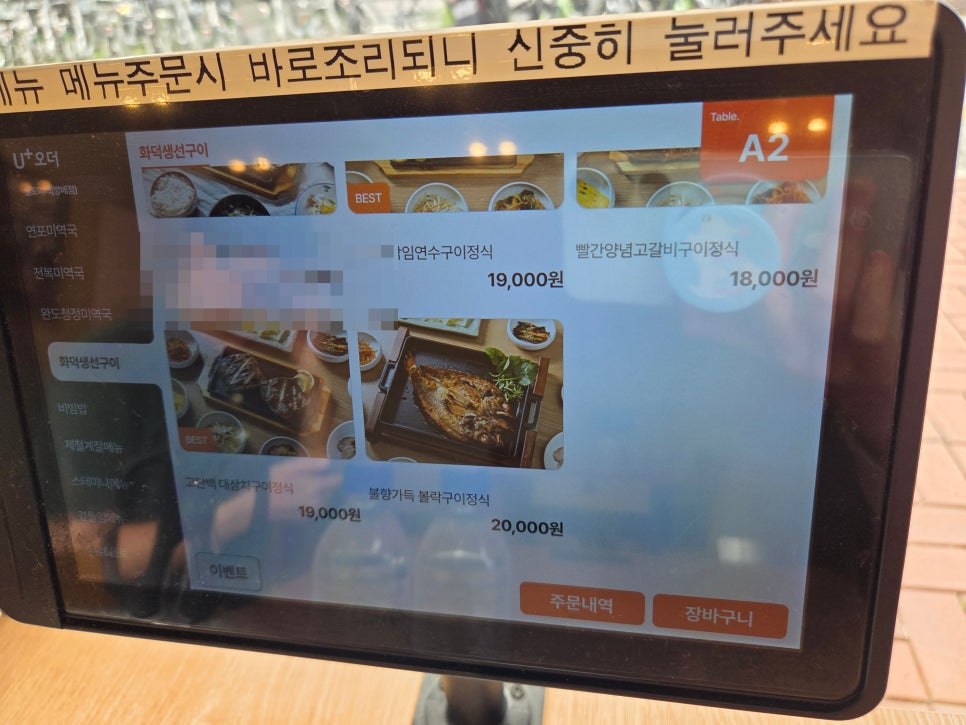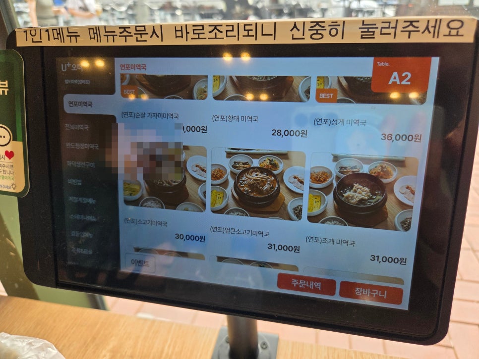 주문은, 각 테이블마다 키오스크가 있어서 여기를 통해 주문하면 됨.