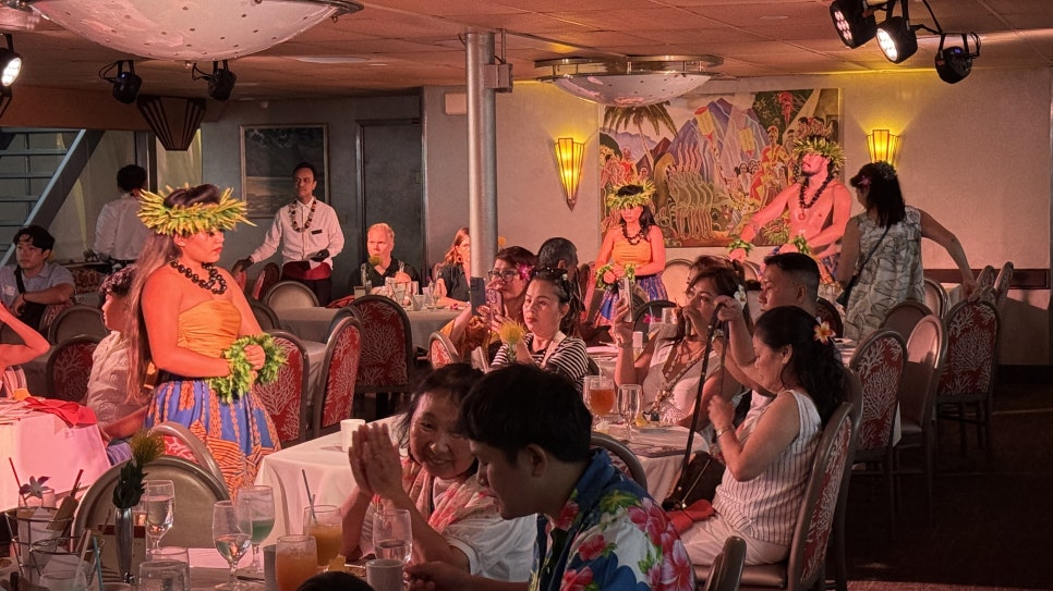 음식 서빙과 함께 공연도 본격적으로 시작한다. 누구에게나 익숙한 팝송 공연을 시작으로 하와이 원주민이 전통 복장을 하고 폴리네시안 공연을 펼친다. 가족 단위 여행객이 많이 찾는 만큼 공연 중간중간 훈훈한 시간도 진행한다. 사회자가 신혼여행이거나 결혼 20주년, 생일인 사람 등 기념일을 맞은 테이블이 있는지 묻고 각각 사연자마다 모두에게 축하받을 수 있도록 박수를 유도한다.