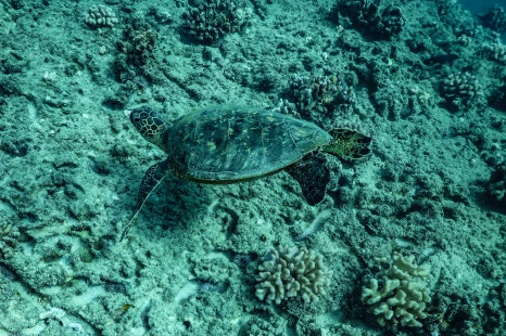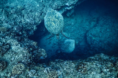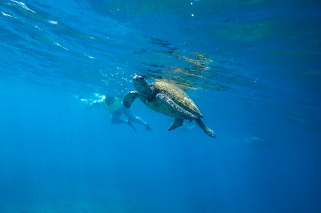돌고래 먼저 난 다음 하외이안 녹색 거북을 만날 차례다. 거북이는 하와이에서도 장수, 행운의 상징으로 통한다. 돌고래 서식지에서는 스노클링 자체가 불가능하지만 거북이는 다르다. 스노클링을 하면서 거북이를 쉽게 마주치게 되는데 절대 만져서는 안 된다. 입수 전 가이드들이 최소 3m 이상은 거리를 두라고 거듭 강조한다. 자칫 거북이를 만지게 되면 최소 1500달러에서 많게는 1억 달러까지 벌금을 물 수 있다.