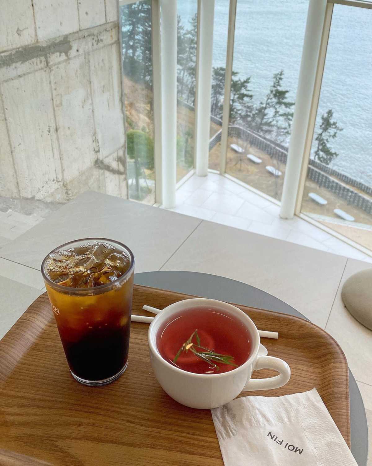 넓은 통창으로 보이는 끝없이 펼쳐진 오션뷰가 멋진 여수 ‘모이핀’. 높은 천장까지 모두 통창이라 아름다운 여수의 하늘과 바다를 한 눈에 담을 수 있다. 헤이즐넛 커피에 고소한 크림이 올라간 아인슈페너와 블루베리와 프리미엄 요거트가 들어간 베리요 스무디 등이 시그니처 메뉴. 다양한 베이커리도 준비되어 있어 오션뷰를 바라보며 느긋하게 커피와 빵을 즐기기 좋다.