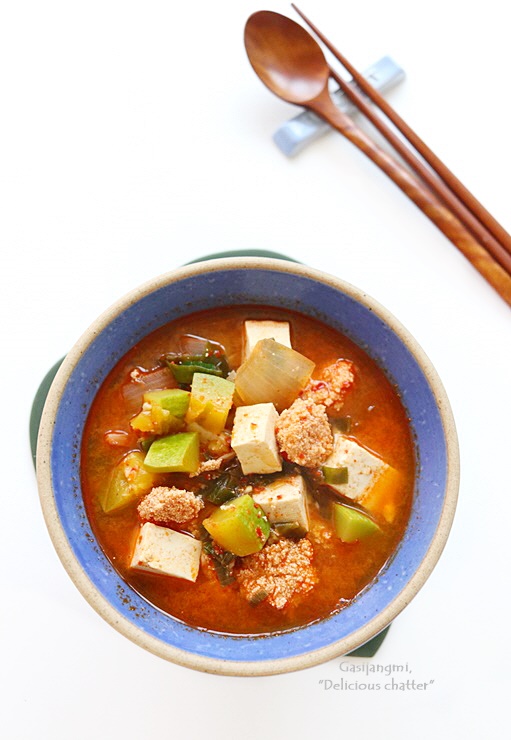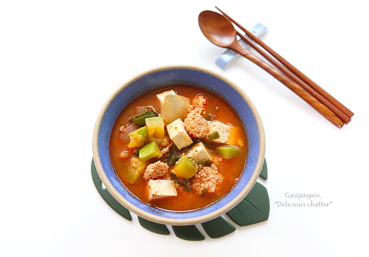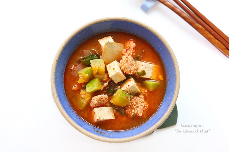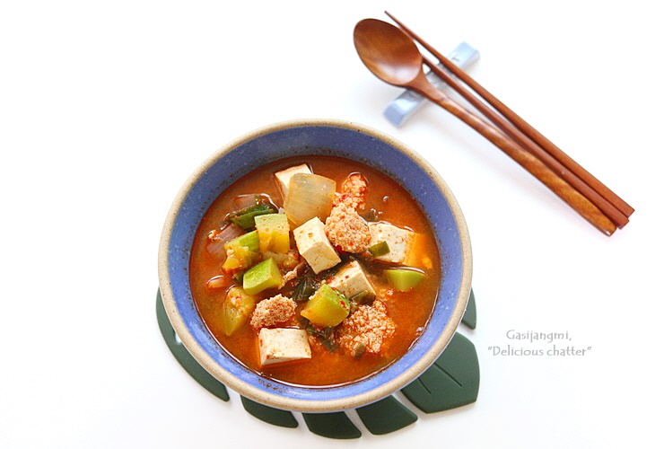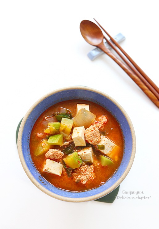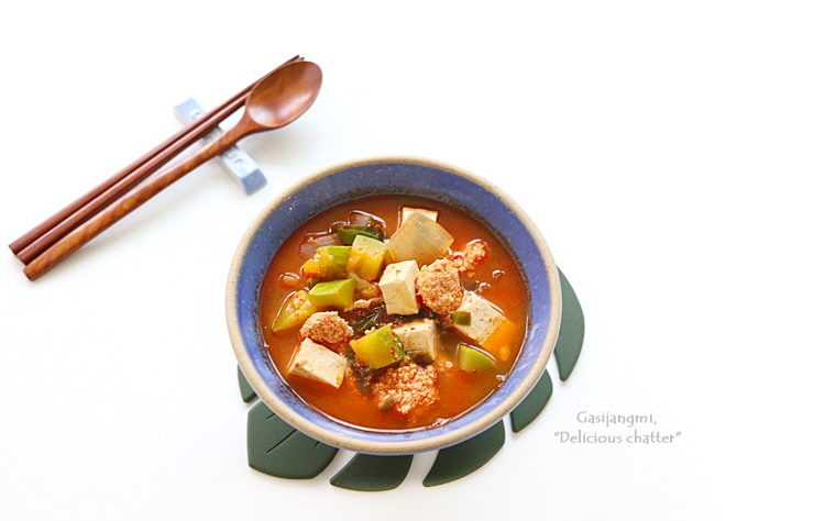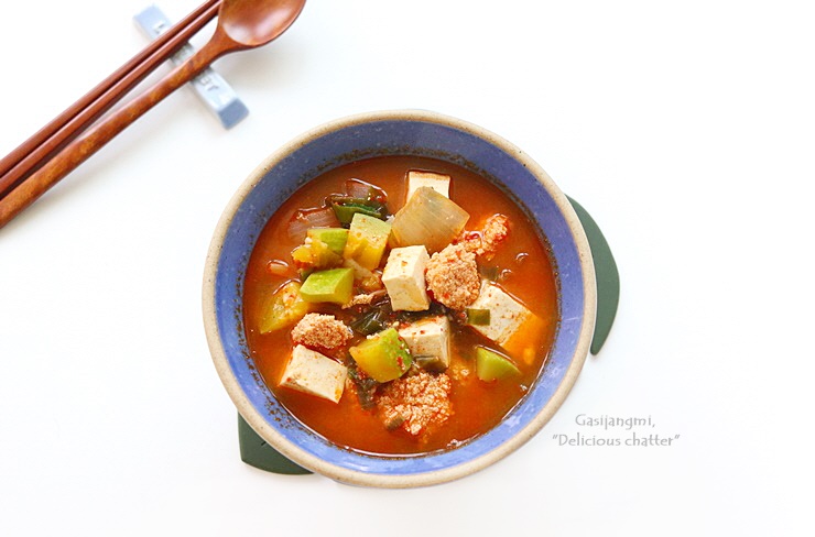 냉장고파먹기로 만든 찌개요리로 냉장고 야채칸 애호박도 소진할 겸 끓여봤어요.