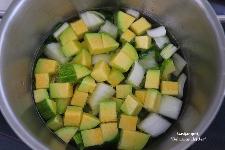 다시마 육수, 애호박, 양파를 넣고 끓여주세요.
