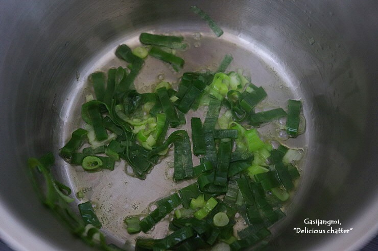 팬에 들기름을 두르고 송송 썬 대파 반을 넣고 달달 볶다가