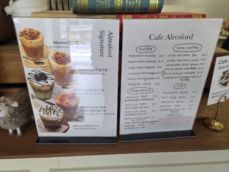 커피는 시그니처음료인 (알포넛.알포멜.알포숲.알포스크림라떼.알포초) 4가지가 있는데 다 크림라떼임.
